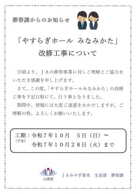 JAみやぎ登米「やすらぎホール みなみかた」改修工事について