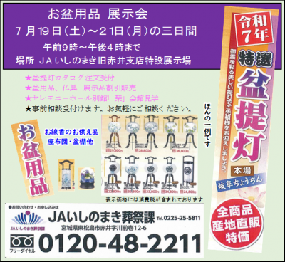 JAいしのまき旧赤井支店特設展示場にてお盆用品展示販売会を開催いたします。