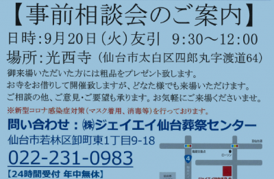 9月20日(火)友引 9時30分~12時まで光西寺におきまして事前相談会を開催いたします。