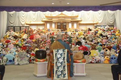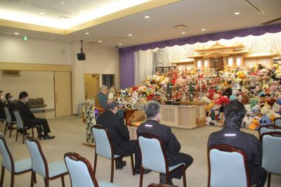 JA加美よつば葬祭会館「やすらぎホールよつば」にて、令和2年12月7日(月)11:00から人形感謝際を開催いたしました。今回は新型コロナウイルス感染予防の為、前日の12月6日(日)に供養する人形を受付し、当日は住職・スタッフのみで執り行った。祭壇には、大切にしてきた「ぬいぐるみ」・「人形」・「こけし」などぎっしりと並べられ、感謝の気持ちを込めて、葬儀と同様に合掌から始まり、香林寺の副住職がお経をあげて供養が行われました。