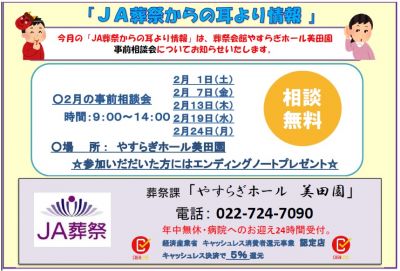 お問い合わせ先:やすらぎホール美田園(022)724-7090