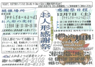 やすらぎホールよつばにて「お人形感謝祭」を開催します。