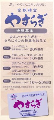 JA仙台ではご葬儀等の特典が受けられる「やすらぎ会員」を募集しております。