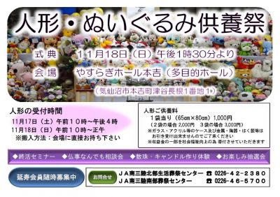 JA南三陸『やすらぎホール本吉』にて「人形・ぬいぐるみ供養祭」を開催します。