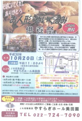 やすらぎホール美田園にて「お人形・ぬいぐるみ供養祭」を開催いたします。
