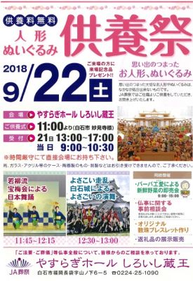 (株)ジェイエイ仙南サービス『やすらぎホールしろいし蔵王』にて「人形・ぬいぐるみ供養祭」を開催します。