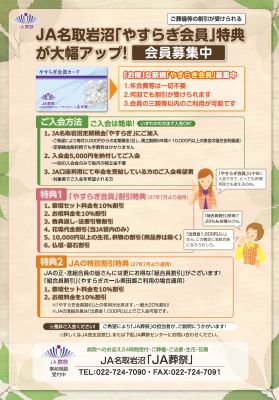 JA名取岩沼ではご葬儀等の割引が受けられる「やすらぎ会員」を募集しております。