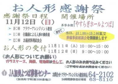 やすらぎホール加美よつばにて「お人形感謝祭」を開催します。