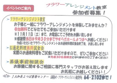 供養式の他にも「フラワーアレンジメント教室(要予約)」や『葬儀事前相談』など様々なイベントを用意しております☆