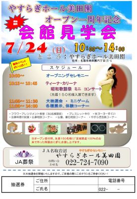 JA名取岩沼「やすらぎホール美田園」のオープン1周年を記念し、会館見学会を開催いたします。